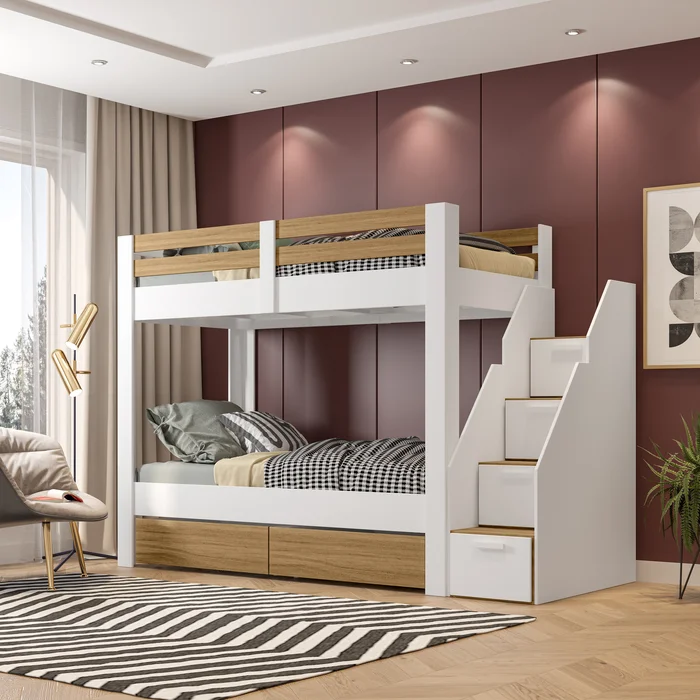 • Beliches com gavetas embutidas: ótima solução para quem precisa de espaço extra para guardar roupas, brinquedos ou objetos pessoais.