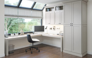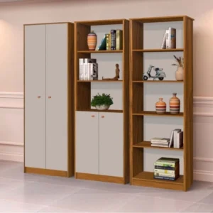 • Armários e estantes: armários altos ou baixos, com portas de correr ou batente, estantes para livros, arquivos ou materiais de uso diário;